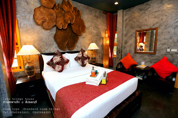 การตกแต่งที่เรียบง่าย ผนังงานปูนเปลื่อยผสมผสานกับงานไม้แกะสลักเรียนแบบใบบัวใบใหญ่ๆตกแต่งใส่ไว้เต็มผนัง มองดูสบายตา มีม่านทอดยาวจากเพดานถึงพื้นเป็นแดงดิ้นทองเข้าชุดกับการตกแต่งบนเตียงนอน เรามีชุดสปาครบเซท ผิวกายและสปาผมไว้บริการทุกห้อง เปิดประตูออกมา ท่านจะพบจุดชมวิวหลักของรีสอร์ท พร้อมตรงระเบียงสามารถนั่งชมพระอาทิตย์ตกพร้อมวิวร์แม่น้ำ และมินิบาร์ในห้องพัก พร้อมสิ่่งอำนวยความสะดวกครบครัน เป็นอีกห้องที่เหมาะและพิเศษมากสำหรับคู่รักและพ้องเพื่อนในพื้นที่ใช้สอย 36 ตรม.